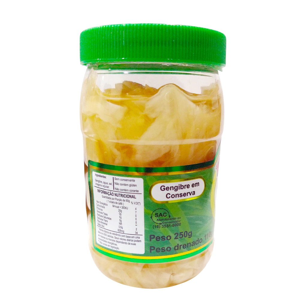 Embalagem: Contendo um pacote de Gengibre em conserva choga-gari com 110 gramas de gengibre drenado ou 1400 gramas líquido.