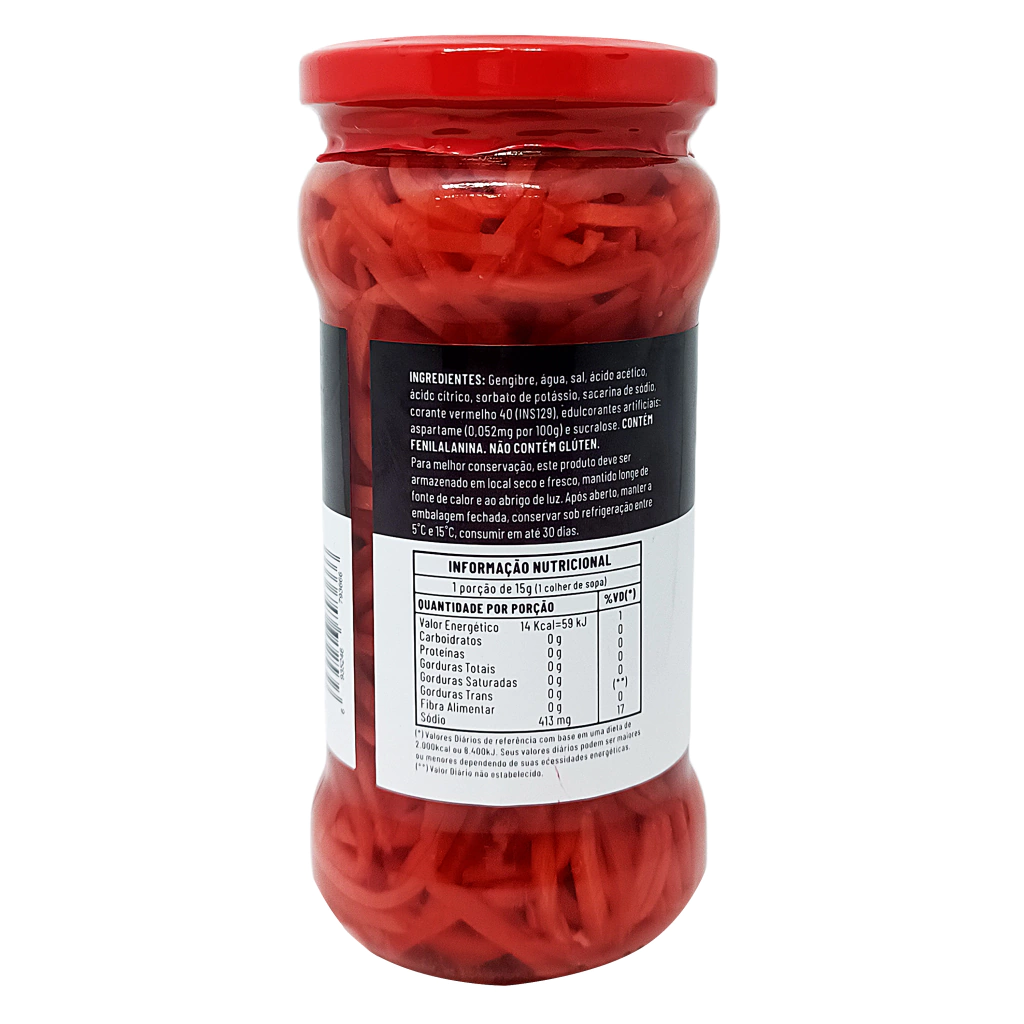 Ingredientes: Gengibre, água, sal, ácido cítrico, sorbato de potássio, pigmento vermelho.