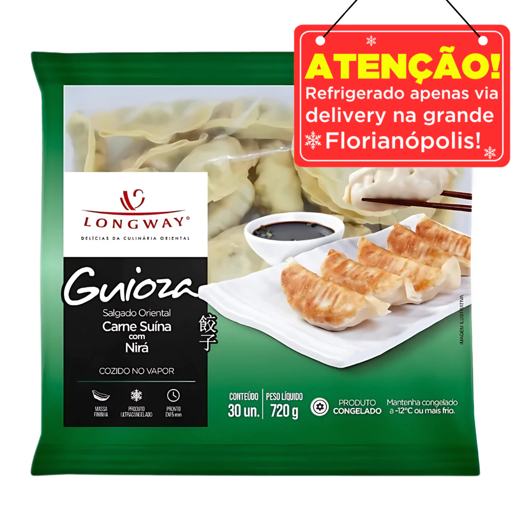 O Guioza de Carne Suína com Nirá é um produto da marca Long Way, conhecido por sua massa leve e baixa em calorias e recheio saboroso de carne suína e nirá. É prático e fácil de preparar, podendo ser cozido a vapor, frito ou grelhado. Perfeito para refeições rápidas e deliciosas com um toque oriental.