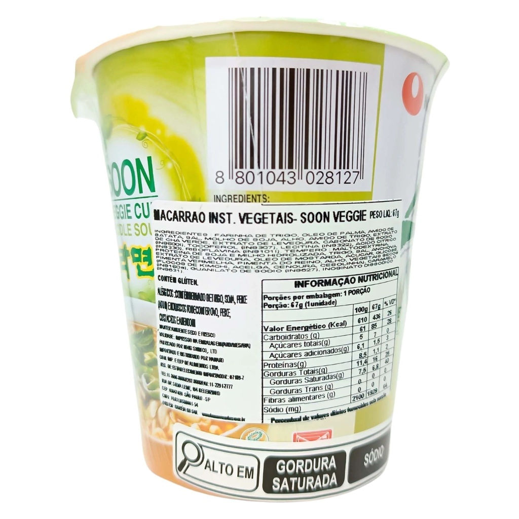Ingredientes: Macarrão: farinha de trigo, óleo de palma, amido de batata, sal, extrato de levedura, molho de soja, alho, extrato de chá verde, proteína de soja hidrolizada, maltodextrina, extrato de levedura, sal, soja, açúcar, pimenta vermelha, pimenta-do-reino, gengibre, cebola, cebolinha, cogumelo de shitake, carbonato de sódio(INS500i) tocoferol (INS307), lecitina (INS322), ácido cítrico (INS330), riboflavina (INS101i), inosinato dissódio (INS631), guanilato de sódio(INS627).